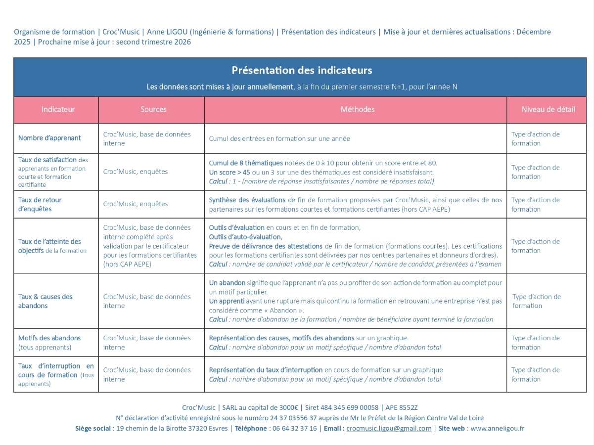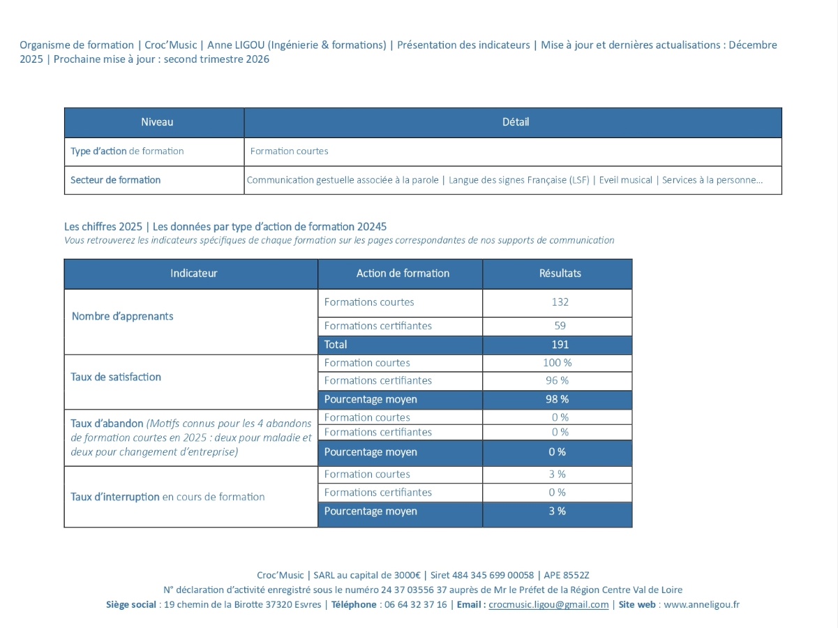 L’année de référence est rappelée lorsque des statistiques sont affichées. L’absence de taux indique que la formation n’a pas eu lieu au cours de l’année. Les données et indicateurs présentés doivent être analysés avec prudence. Un taux moyen peut s’expliquer par d’autres phénomènes externes dont il faut tenir compte. Plusieurs paramètres peuvent expliquer un niveau plus élevé ou plus faible que la moyenne, quelle que soit la qualité de notre prestation : le tissu économique local, le dynamisme du marché du travail, le type de formation dispensé, etc…Croc’Music vous assure qu’il met tout en œuvre pour améliorer la qualité de toutes les formations proposées et reste disponible si besoin, notre équipe est à votre disposition.